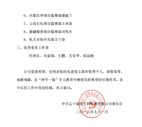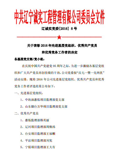 7月1日下午,公司黨委召開《慶祝建黨95周年暨“一優(yōu)兩先”表彰視頻大會》。主會場設(shè)在公司一樓會議室,中海油惠州項目監(jiān)理部黨支部、甘肅華亭項目監(jiān)理部黨支部、神華寧煤項目監(jiān)理部黨支部、煙臺萬華項目監(jiān)理部黨支部設(shè)立視頻分會場。黨委副書記馮玉琢主持了視頻大會。首先為新黨員中海油惠州項目監(jiān)理部黨支部的李婷婷舉行了入黨宣誓儀式,公司黨委委員劉興善同志宣讀了公司黨委對戰(zhàn)勝、吳琪轉(zhuǎn)為中共正式黨員的批復(fù)。公司黨委委員馬俊同志宣讀了“一優(yōu)兩先”表彰決定。黨委書記孫學(xué)良結(jié)合公司實際做了慶祝建黨95周年的講話。最后全體黨員重溫的入黨誓詞,進行入黨宣誓。