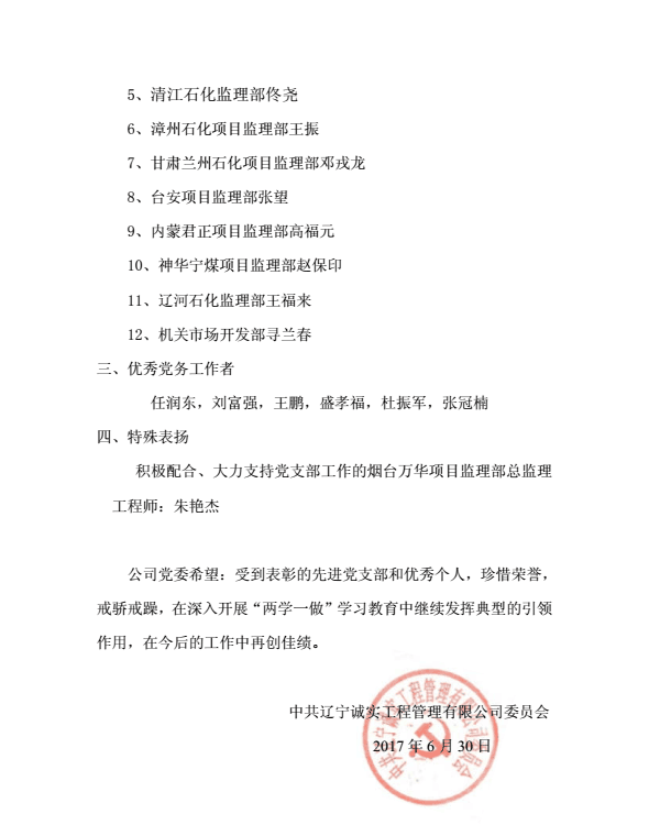 為慶祝中國(guó)共產(chǎn)黨建黨96周年,公司黨委于2017年6月30日下午在公司一樓會(huì)議室召開(kāi)了慶祝建黨96周年暨“一優(yōu)兩先”表彰視頻大會(huì)。公司機(jī)關(guān)、撫順各項(xiàng)目監(jiān)理部及在撫的黨員同志在主會(huì)場(chǎng)參加了大會(huì),中海油惠州項(xiàng)目監(jiān)理部黨支部、甘肅華亭項(xiàng)目監(jiān)理部黨支部、寧夏石化項(xiàng)目監(jiān)理部黨支部、中化泉州項(xiàng)目監(jiān)理部黨支部、廣西石化項(xiàng)目監(jiān)理部黨支部、蘭州石化項(xiàng)目監(jiān)理部黨支部、內(nèi)蒙古君正項(xiàng)目監(jiān)理部黨支部、神華寧煤項(xiàng)目監(jiān)理部黨支部、煙臺(tái)萬(wàn)華項(xiàng)目監(jiān)理部黨支部設(shè)立視頻分會(huì)場(chǎng)。黨委委員馬駿主持了視頻大會(huì)。首先,公司黨委副書(shū)記馮玉琢同志宣讀了“一優(yōu)兩先”表彰決定。接著,黨委書(shū)記孫學(xué)良結(jié)合公司實(shí)際做了慶祝建黨96周年的講話。最后全體黨員重溫的入黨誓詞,進(jìn)行入黨宣誓。