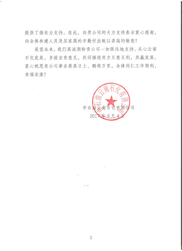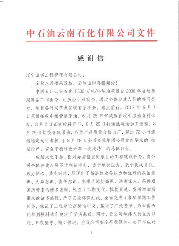 公司于今日收到由中國石油云南石化有限公司發(fā)給我方的《感謝信》一封,信中提到:對于我方所監(jiān)理服務的煉油項目自2006年啟動籌備工作至今,我方監(jiān)理人員不計利益得失,勇于承受壓力,使得該項目近日順利投產試車成功。對于我單位的工作給予極大的肯定以及衷心的感謝。對方還提到:希望雙方在日后的共同發(fā)展中,互惠互利,共贏發(fā)展。