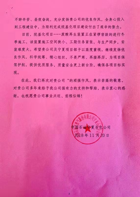 20181120,我公司收到了一封來自業(yè)主——中國(guó)石油天然氣股份有限公司寧夏石化分公司的感謝信。