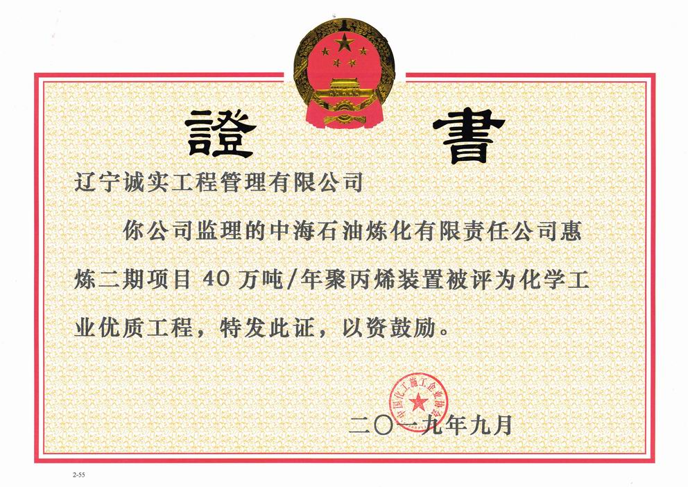 2019年9,我單位所監(jiān)理的“中海石油煉化有限責(zé)任公司惠煉二期項(xiàng)目40萬(wàn)噸/年聚丙烯裝置”被評(píng)為化學(xué)工業(yè)優(yōu)質(zhì)工程獎(jiǎng)