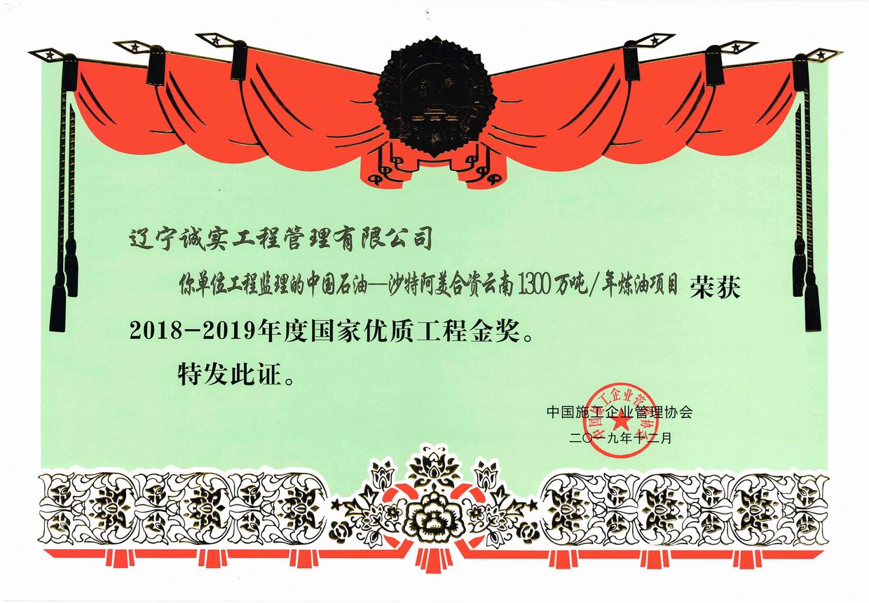 2019年12我單位所監(jiān)理的“煙臺萬華搬遷MDI一體化項目氯堿裝置區(qū)”被評為2018-2019年度國家優(yōu)質工程獎、“中國石油-沙特阿美合資云南1300萬噸/年煉油項目被評為2018-2019年度國家優(yōu)質工程金獎。