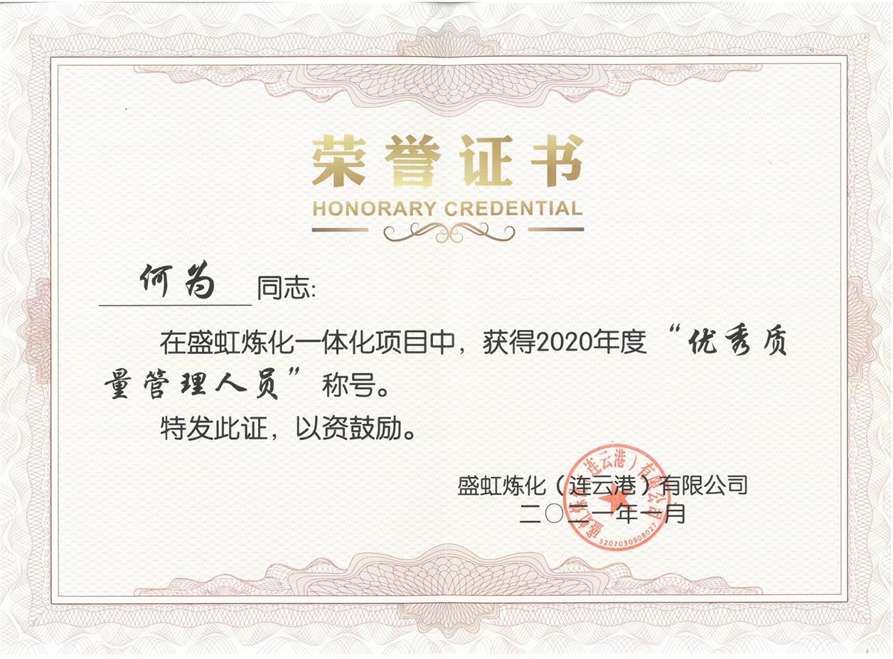 熱烈祝賀何為同志榮獲盛虹煉化一體化項目2020年度“優(yōu)質(zhì)質(zhì)量管理人員”榮譽(yù)稱號