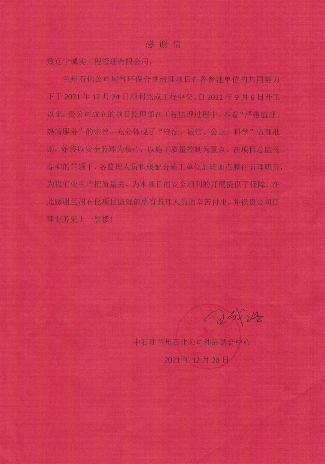 1228日,蘭州項(xiàng)目監(jiān)理部收到中石油蘭州石化公司油品調(diào)合中心發(fā)來(lái)的感謝信。信中,業(yè)主單位對(duì)項(xiàng)目部全體監(jiān)理人員在項(xiàng)目開(kāi)展過(guò)程中的工作表現(xiàn)給予了充分的肯定和高度的贊譽(yù)。是對(duì)我公司卓越的項(xiàng)目管理水平和強(qiáng)大的人才隊(duì)伍的最好見(jiàn)證,同時(shí)也完美的展現(xiàn)了我們一貫以來(lái)敢打硬仗、善打難仗、能打勝仗的優(yōu)良傳統(tǒng)和作風(fēng)。希望各項(xiàng)目部要以此為動(dòng)力,不忘初心,牢記使命,擔(dān)當(dāng)作為,為樹立誠(chéng)實(shí)品牌、打造誠(chéng)實(shí)形象再立新功!