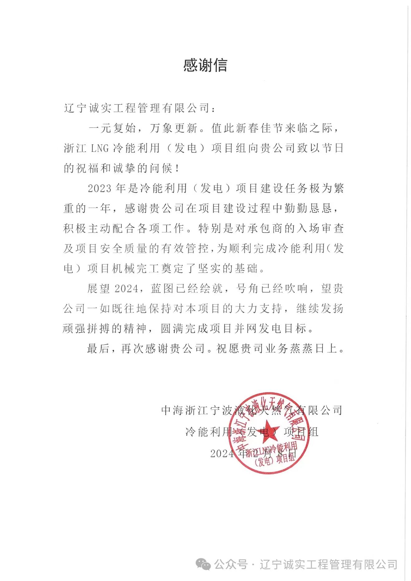 遼寧誠實2023年度承擔江蘇液化天然氣質量安全環(huán)保安全監(jiān)督工作,該項目在總監(jiān)張東偉的帶領下,全體成員勠力同心,克服島上工作環(huán)境不利等因素的干擾,用一絲不茍的工作態(tài)度出色地完成了本年度安全監(jiān)督工作,確保了各主要工序工作的安全、順利進行。全年共發(fā)現(xiàn)安全問題878個,下發(fā)整改通知單86份,整改率達98%。另外,與生產(chǎn)設備單位協(xié)作,對承包商的安全設備設施及其附件進行定期或不定期的檢查,共計查出相關設備問題170余項,整改率達到100%,從而保證了工程項目高效安全的順利完成。充分展現(xiàn)了遼寧誠實大企的責任與擔當,為企業(yè)贏得了榮譽。由于項目人員出色的表現(xiàn),公司于2024年1月12日,收到了建設單位質量安全環(huán)保部的《表揚信》。