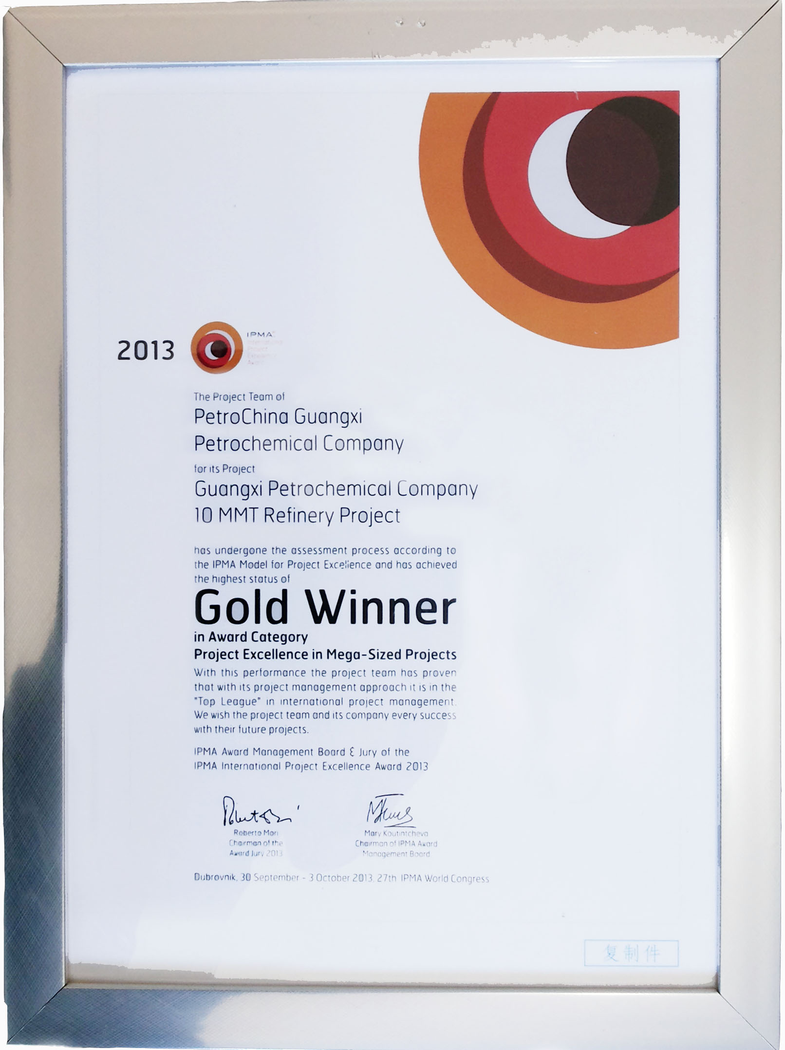 10月2日,從克羅地亞杜布羅夫尼克傳來一個(gè)令人振奮的消息,在當(dāng)?shù)嘏e行的第27屆IPMA國際項(xiàng)目管理大會(huì)上,我公司監(jiān)理的廣西石化千萬噸煉油項(xiàng)目以最高得分,從澳大利亞海水淡化項(xiàng)目、印度HPCL—MITTAL能源公司GGS煉油項(xiàng)目等14個(gè)入圍項(xiàng)目中脫穎而出,榮獲了IPMA國際卓越項(xiàng)目管理最高獎(jiǎng)項(xiàng)—特大型項(xiàng)目金獎(jiǎng)。這是繼神舟六號載人飛船項(xiàng)目(2006,第20屆)、中海油惠州煉油項(xiàng)目(2010,第24屆)之后,中國第3個(gè)獲此殊榮的特大型項(xiàng)目。