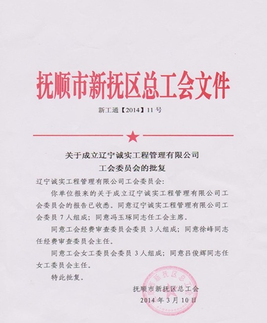 經(jīng)過近兩個月的籌備,誠實工會現(xiàn)已履行完畢各個籌備程序,撫順市新?lián)釁^(qū)總工會已正式批準(zhǔn)成立遼寧誠實工程管理有限公司工會委員會。公司工會由7名委員組成,下設(shè)經(jīng)費審查委員會和女工委員會。公司工會將根據(jù)機關(guān)及項目部的實際情況,相應(yīng)成立工會分會和工會小組,發(fā)揮工會在企業(yè)中的積極作用,為企業(yè)的發(fā)展做出貢獻(xiàn)。