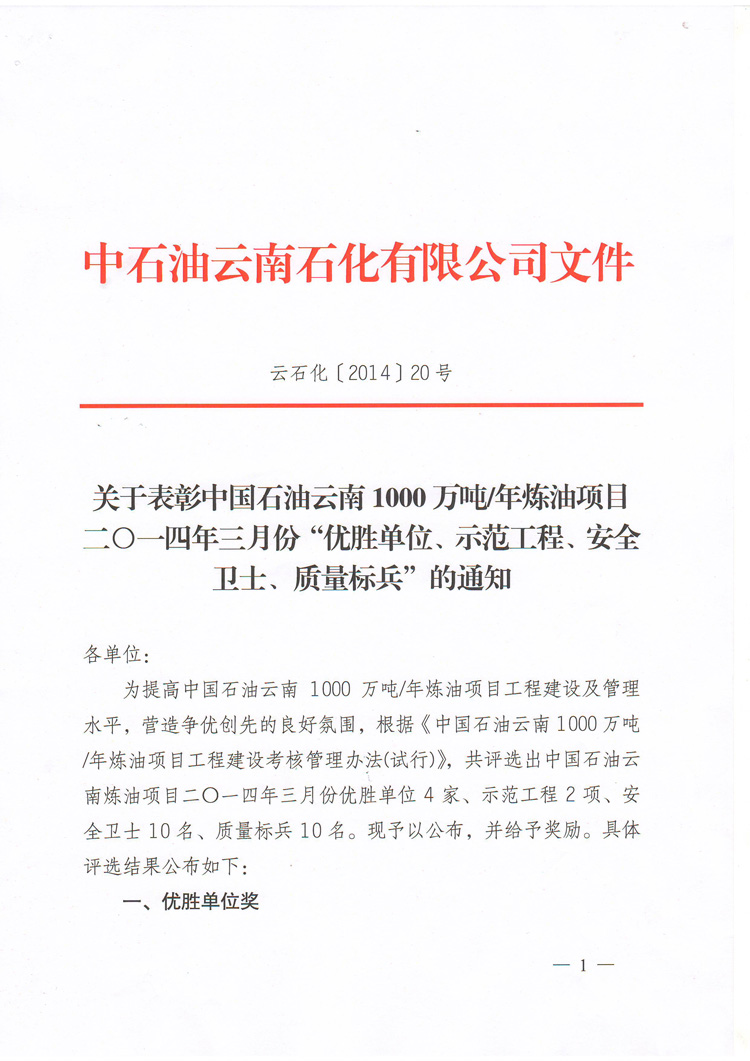 我公司榮獲中國(guó)石油云南1000萬(wàn)噸/年煉油項(xiàng)目2014年3月份“優(yōu)勝單位”稱(chēng)號(hào)