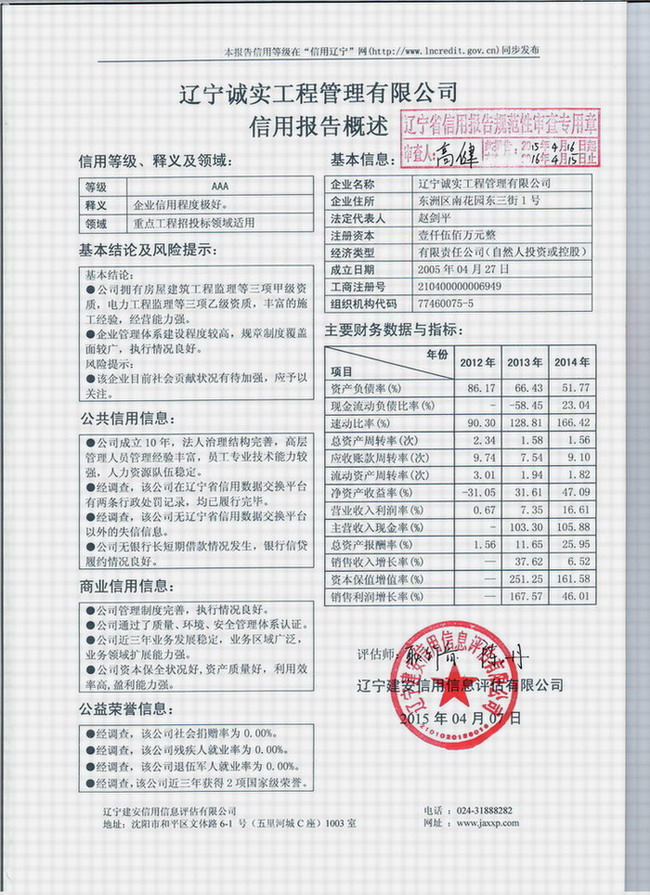 2015年4月,經(jīng)遼寧建安信用信息評估有限公司信用評級委員會(huì)的評定,我公司被確定為最高信用等級“AAA”級。
